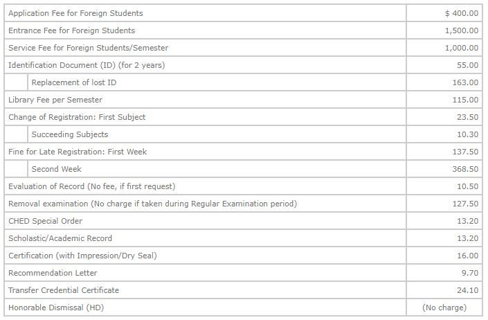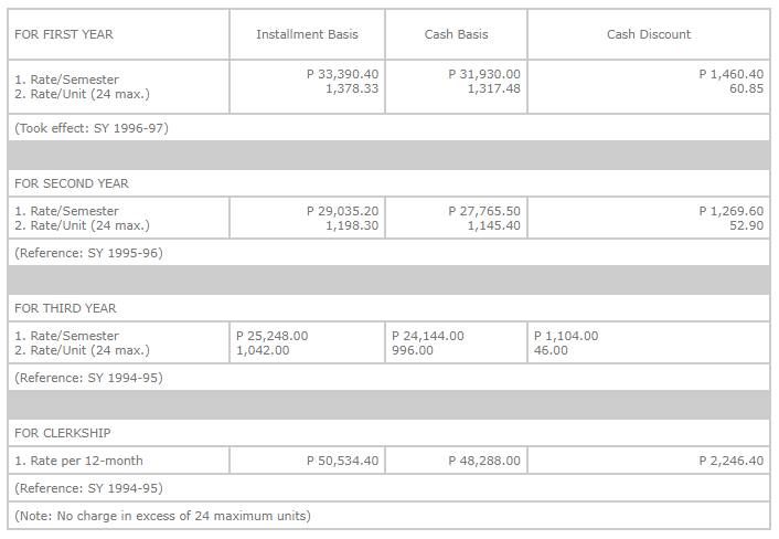 Note: All new students are required to pay the whole assessment, however split-cash is allowed, which is payable within 15 calendar days. For graduating students, miscellaneous fees are payable upon registration of the Certificate of Matriculation (COM).